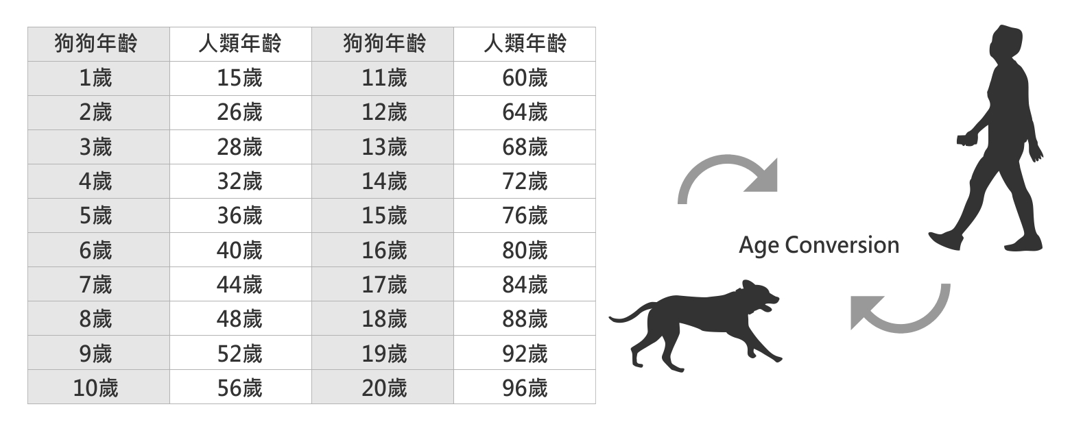 貓狗的年齡就是依照其發育、成熟、衰退期,比照人類模式的比例下去計算的,當然不同種類的貓狗平均壽命也會有長短之分,影響動物壽命長短的因素實在太多、太複雜,所以換算年齡是以平均值去計算的,僅供參考。