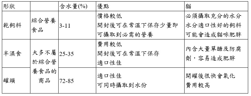 寵物食品根據含水分的多寡與形狀的不同,分為「乾糧」、「半濕食」、「濕食(罐頭、餐包)」;根據用途可以分類為「綜合營養品」、「副食品」、「其他用途食品」。生命階段的營養標準,且能讓寵物同時攝取到水及該種食品,適合作為每日主食的營養食品。