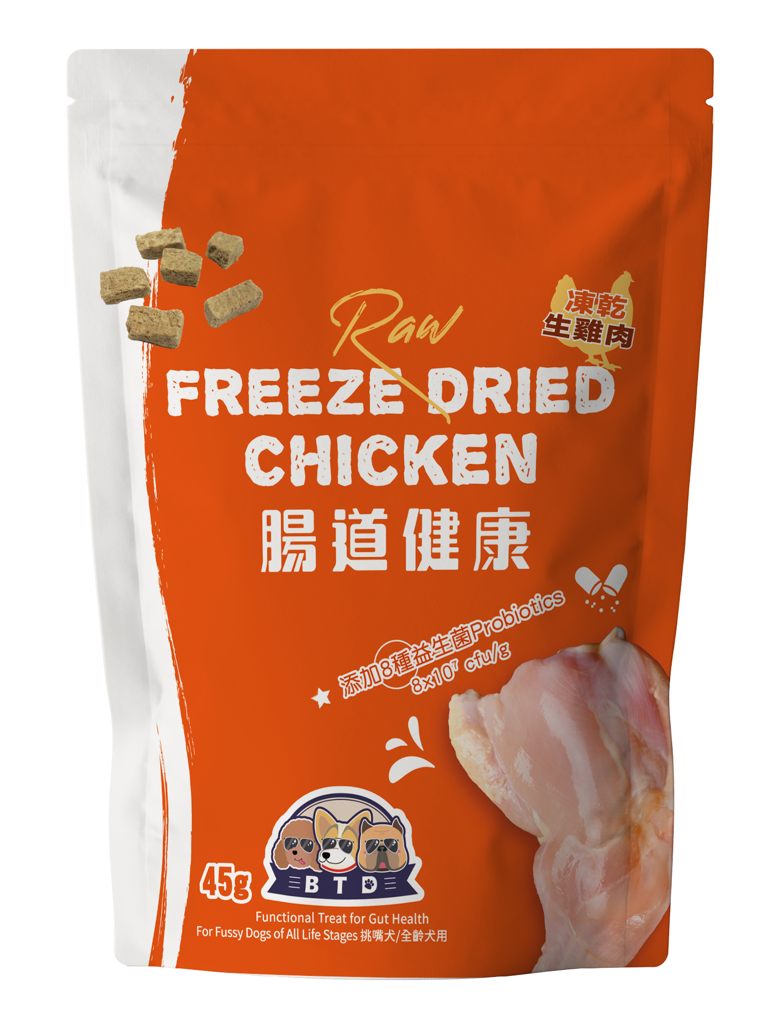 ♦ 嚴選食材:生鮮雞肉、膳食纖維、果寡糖、8種益生菌 8×107 CFU/g(植物乳桿菌、乳雙歧桿菌、短雙歧桿菌、乾酪乳桿菌、副乾酪乳桿菌、醱酵乳桿菌、嗜熱鏈球菌、嗜酸乳桿菌)。