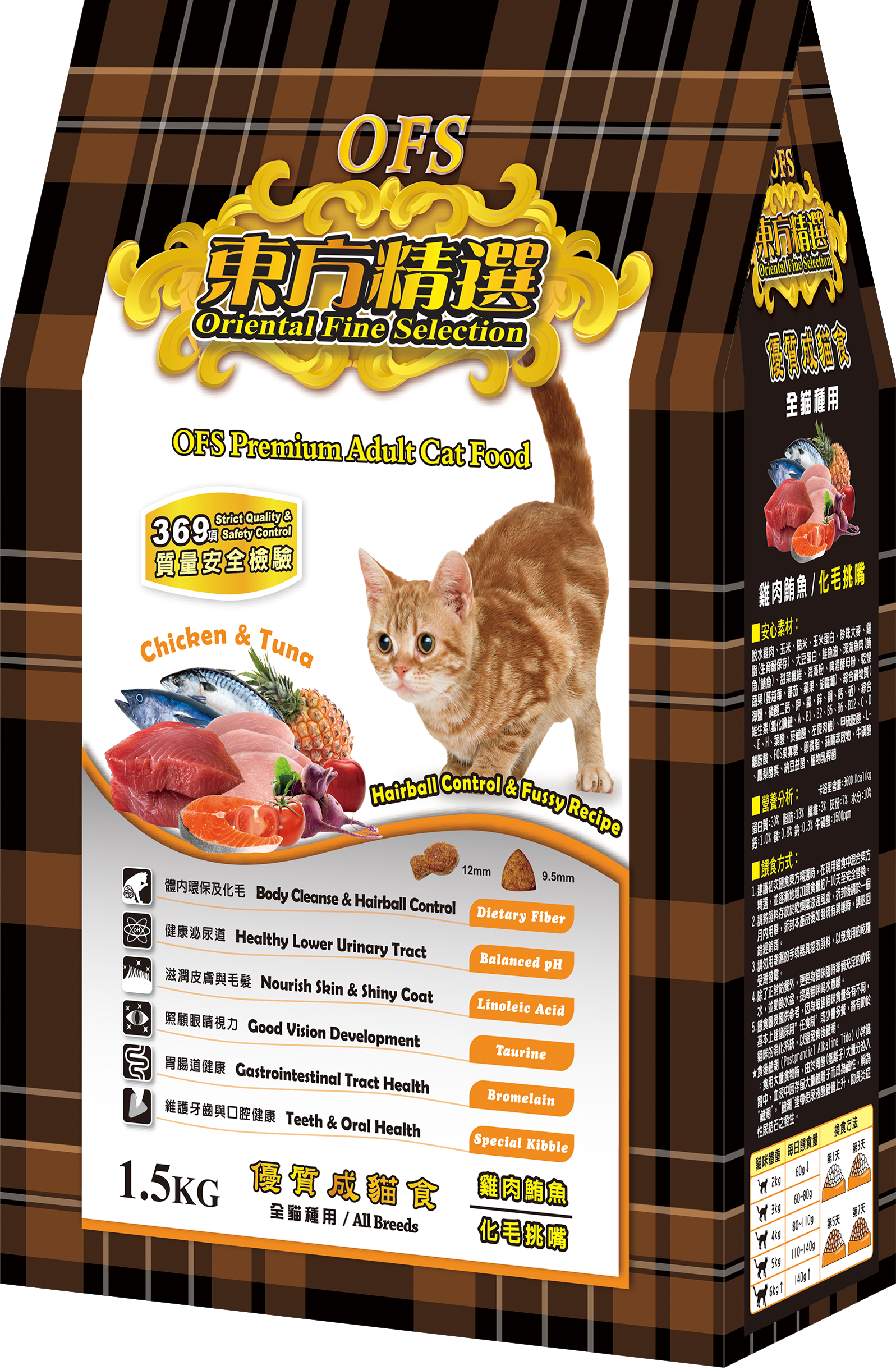 ♦ 嚴選食材:脫水雞肉、玉米、糙米、玉米蛋白、珍珠大麥、雞脂(生育酚保存)、大豆蛋白、鮭魚油、深海魚肉(鮪魚/鯖魚)、甜菜纖維、海藻粉、啤酒酵母粉、乾燥蔬果(蔓越莓、蕃茄、蘋果、胡籮蔔)、綜合礦物質(海鹽、磷酸二鈣、鉀、鐵、鋅、銅、鈣、硒)、綜合維生素(氯化膽鹼、A、B1、B2、B5、B6、B12、C、D、E、H、葉酸、菸鹼酸、左旋肉鹼)、甲硫胺酸、L-離胺酸、FOS果寡糖、卵磷脂、蕬蘭萃取物、牛磺酸、鳳梨酵素、納豆益菌、植物乳桿菌。