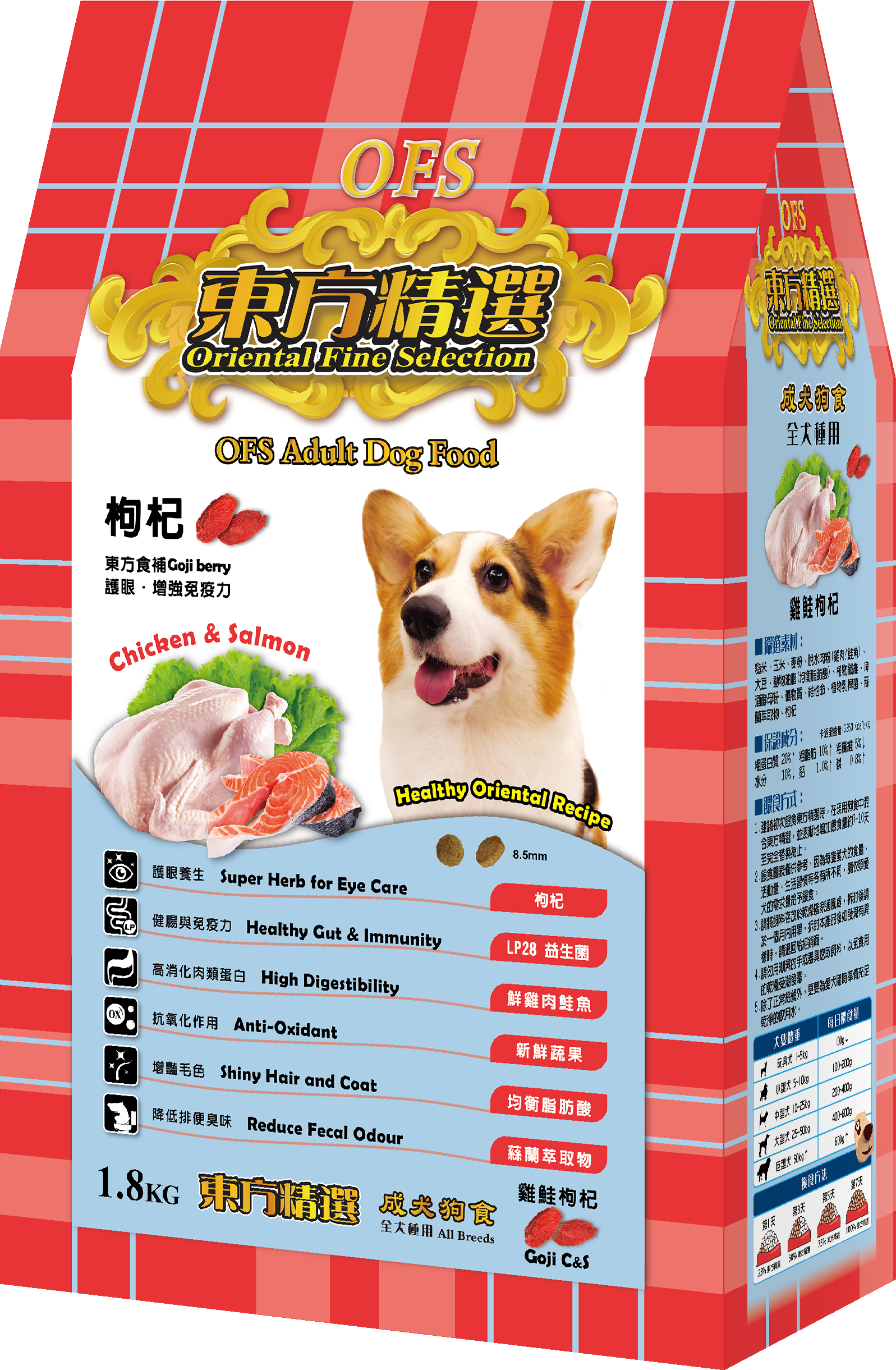 嚴選食材:糙米、玉米、麥粉、脫水肉粉(雞肉/鮭魚)、大豆、動物油脂(均衡脂肪酸)、植物纖維、啤酒酵母粉、礦物質、維他命、植物乳桿菌、蕬蘭萃取物、枸杞